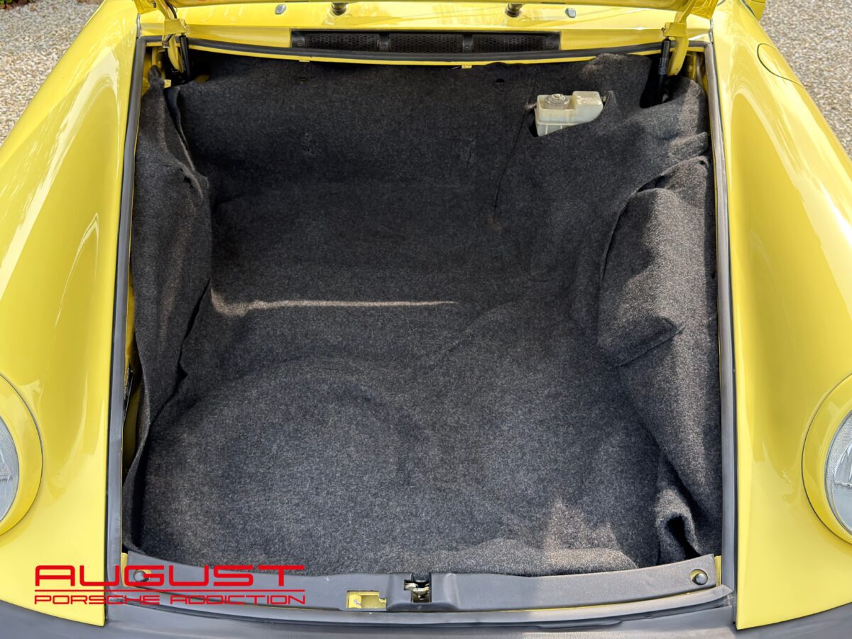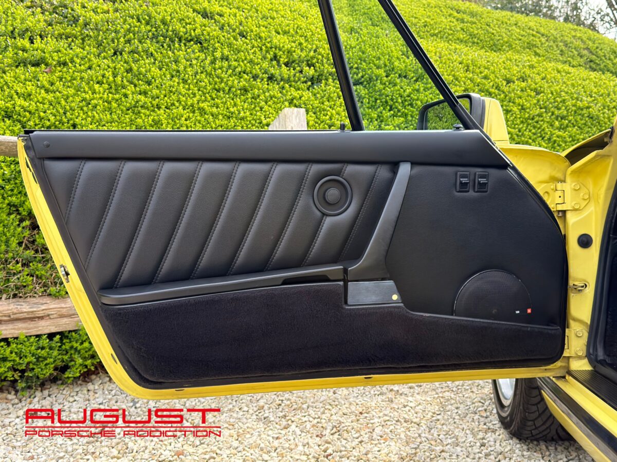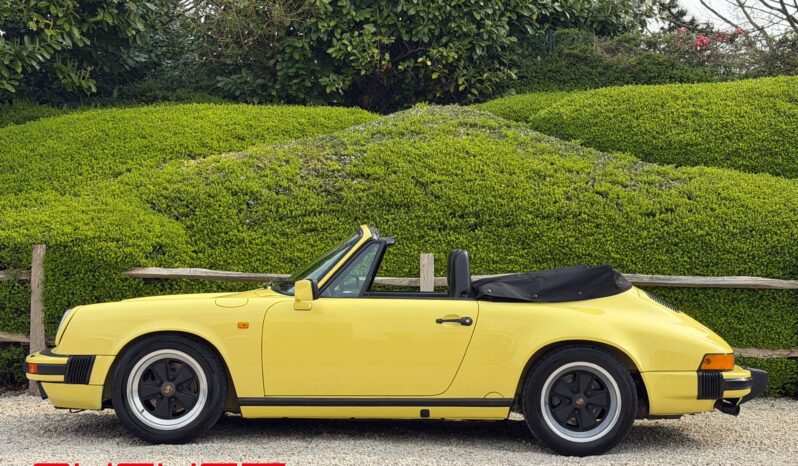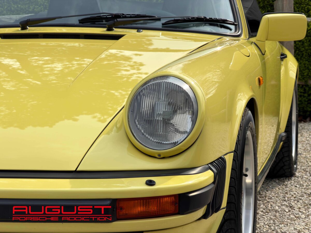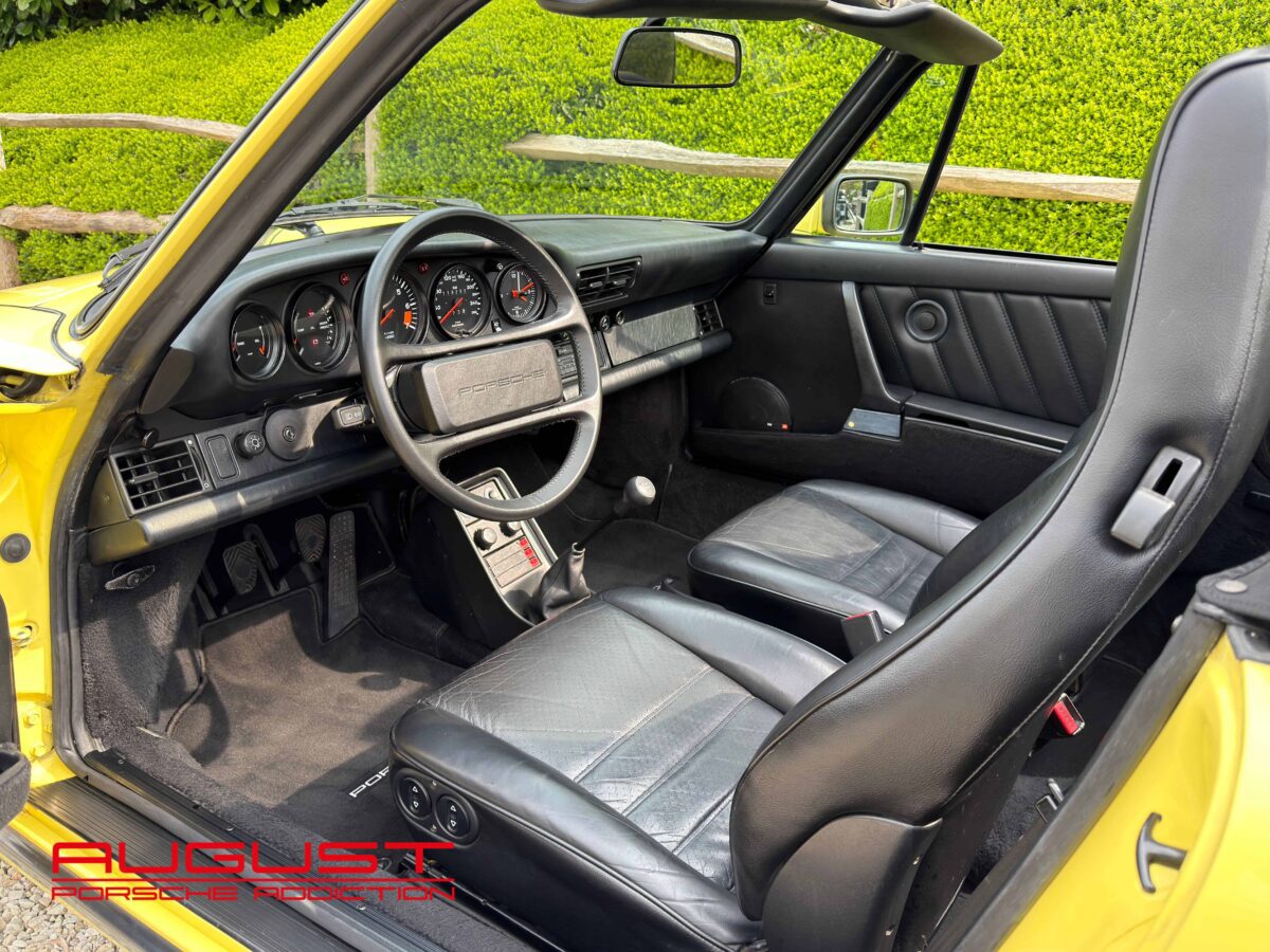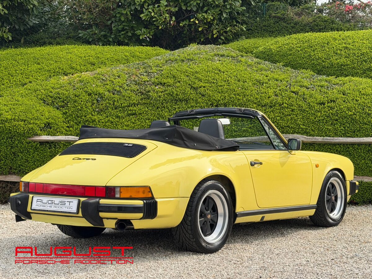 Porsche 911 Carrera 3.2 Cabriolet de 1987. Présentée dans sa configuration extérieur jaune citron intérieur cuir noir. Equipée de la célèbre boite de vitesses G50, cette emblématique 911 est munie des jantes Fuchs 16″ et de la climatisation. Ce collector à la couleur exclusive vous est présenté avec les options suivantes :